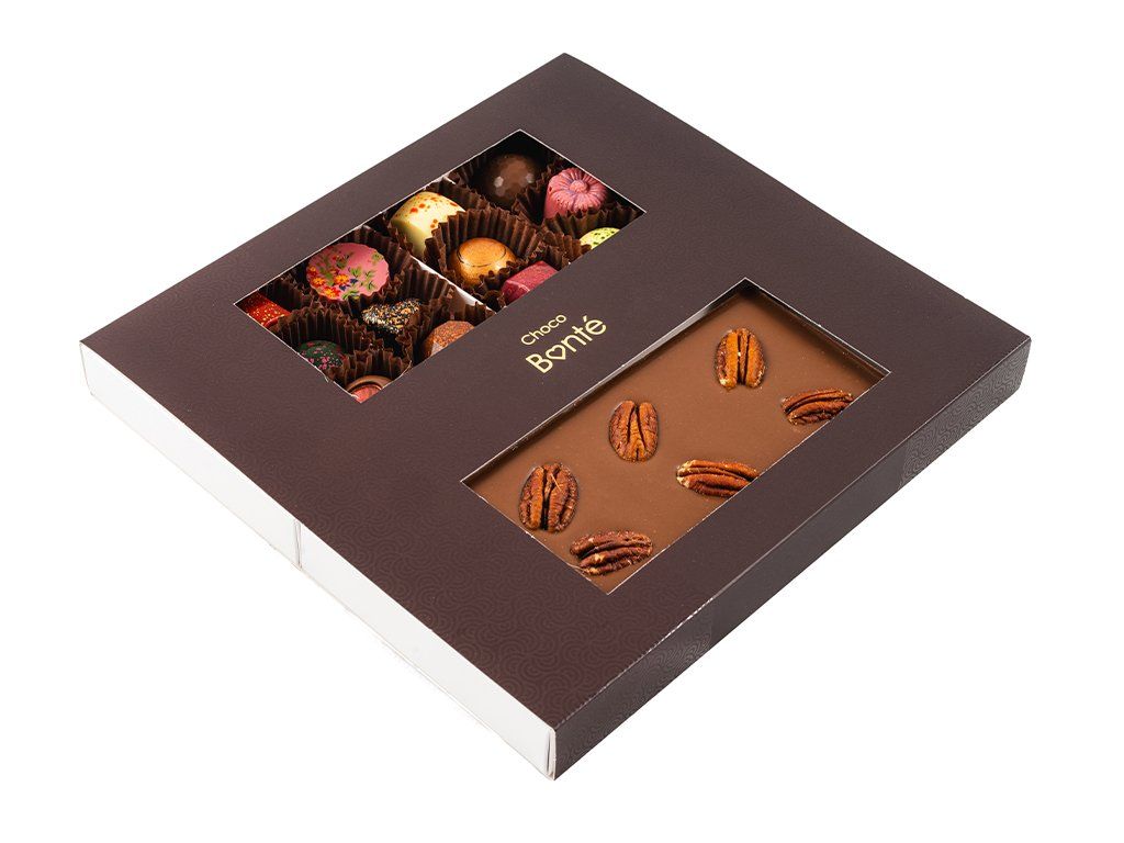 Mléčná čokoláda s pekanovými ořechy pak přidává lahodný, oříškově nasládlý tón a dotváří harmonický čokoládový zážitek.