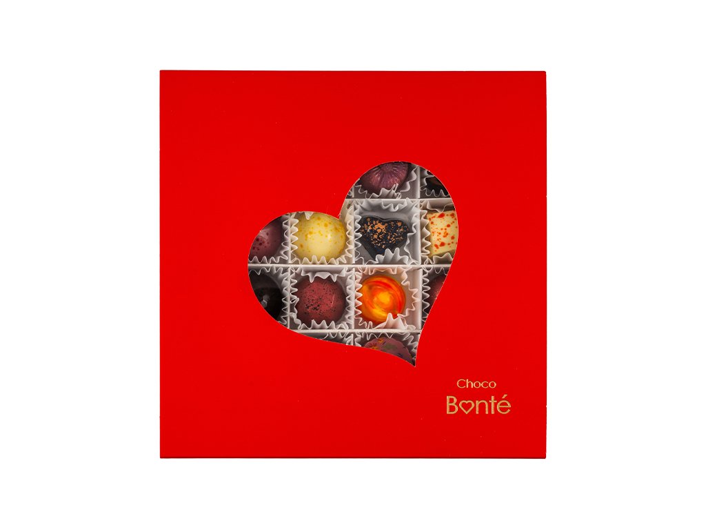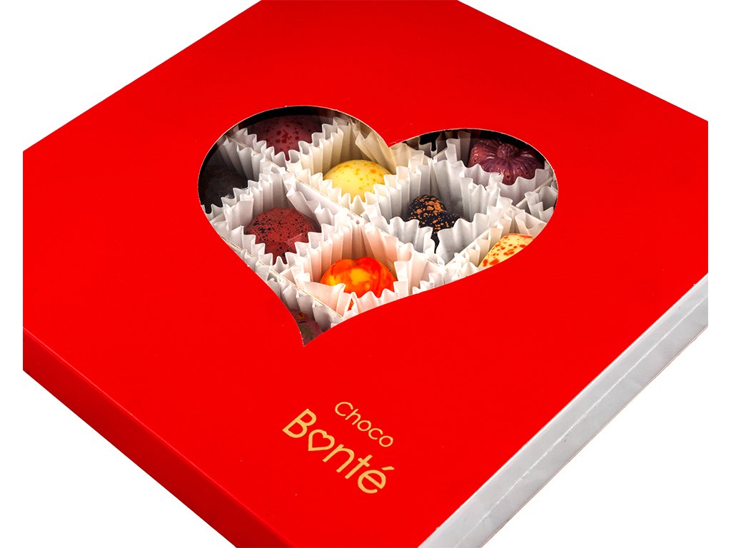Romantický červený obal s efektním srdcovým výsekem odhaluje lahodné pralinky uvnitř a dělá bonboniéru výjimečným dárkem.