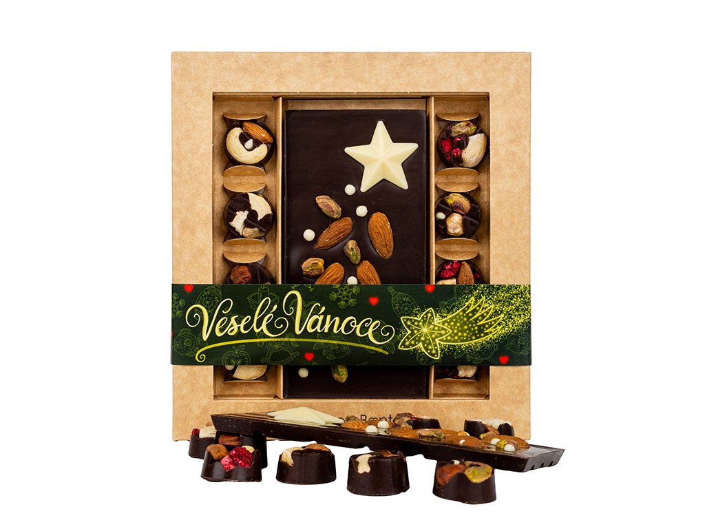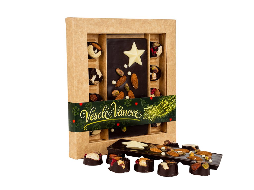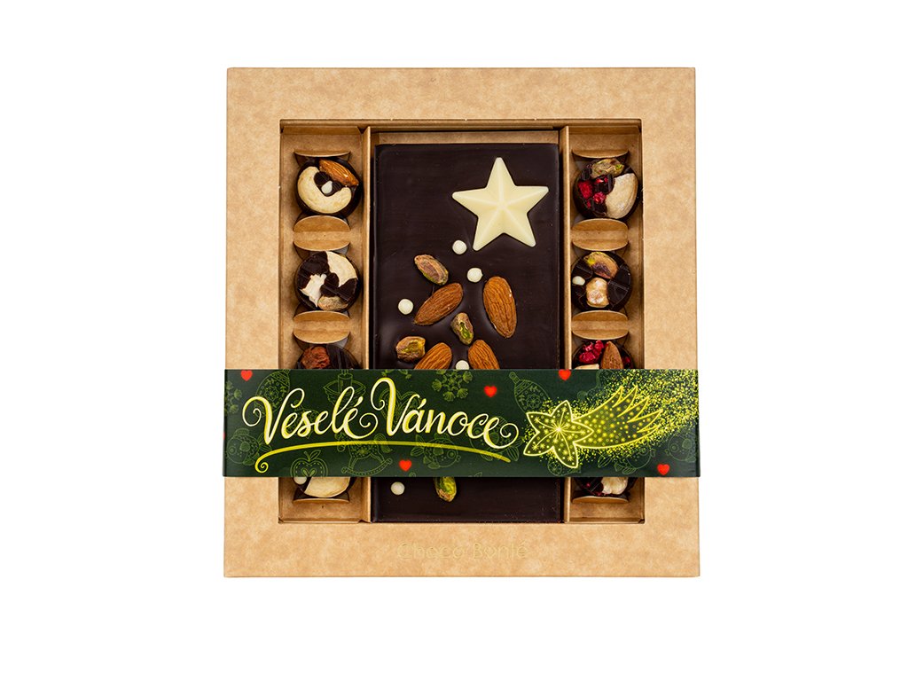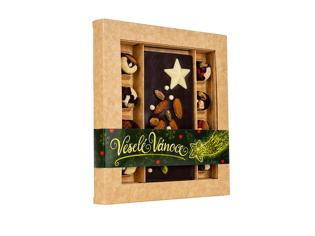 Pripravte sa na sladký adventný čas s našou dárkovou čokoládou v hořké verzi, doplnenou o 8 ručne vyrábaných bonbonů z hořké čokolády s oříšky a lyofilizovanou malinou. Čokoláda je pečlivě dekorovaná a balená v elegantní dárkové kazetě, která potěší každého milovníka kvalitní čokolády. Skvělý vánoční dárek pro ty, kteří ocení kombinaci hořké chuti a luxusního provedení.
