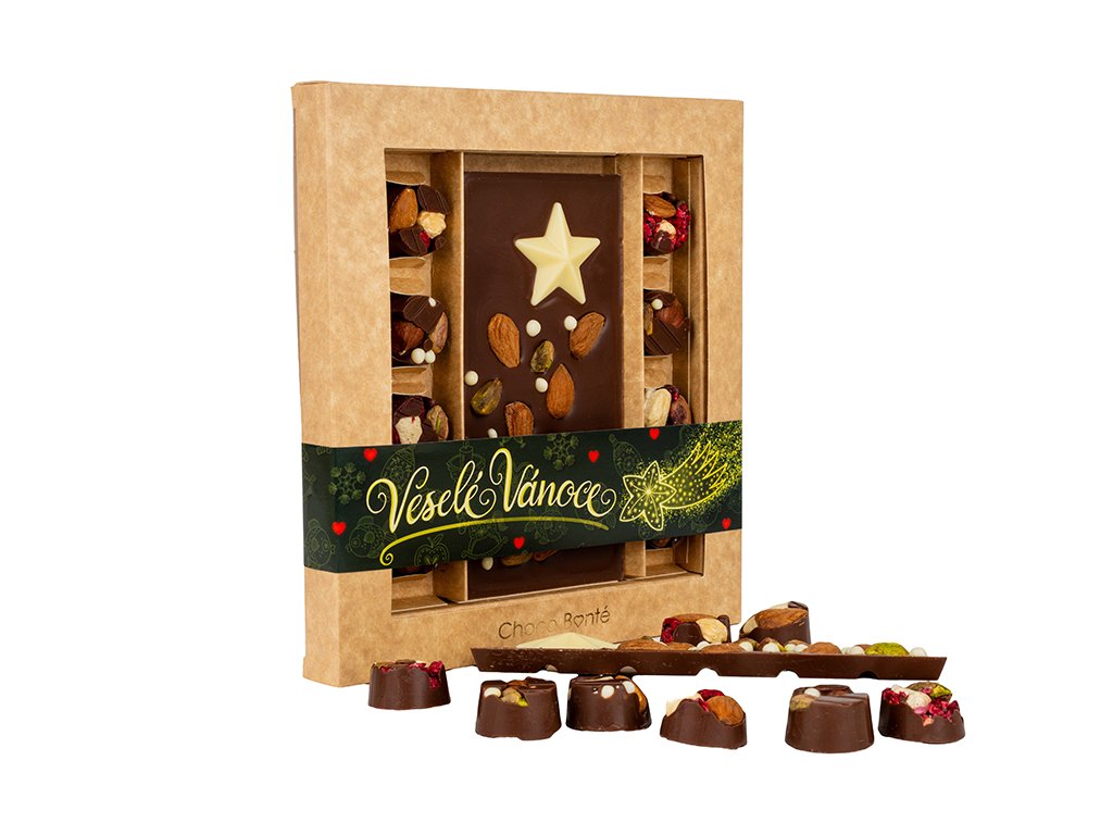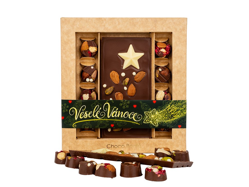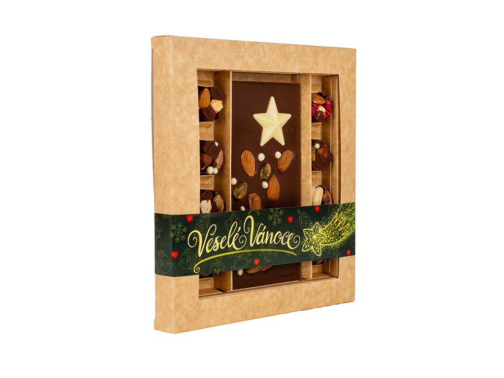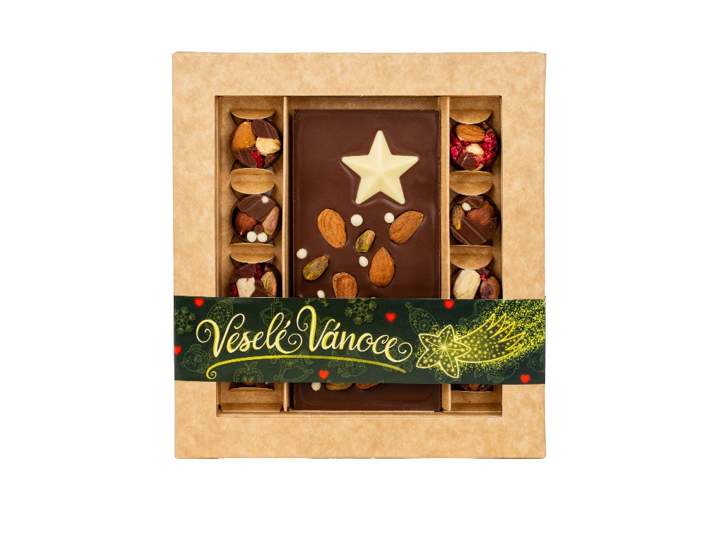 Pripravte sa na sladký adventný čas s našou dárkovou čokoládou v mléčné verzi, doplněnou o 8 ručně vyráběných bonbonů z mléčné čokolády s oříšky a lyofilizovanou malinou. Čokoláda je pečlivě dekorovaná a balená v elegantní dárkové kazetě, která potěší každého milovníka kvalitní čokolády. Skvělý vánoční dárek pro ty, kteří ocení kombinaci mléčné čokolády a luxusního provedení.