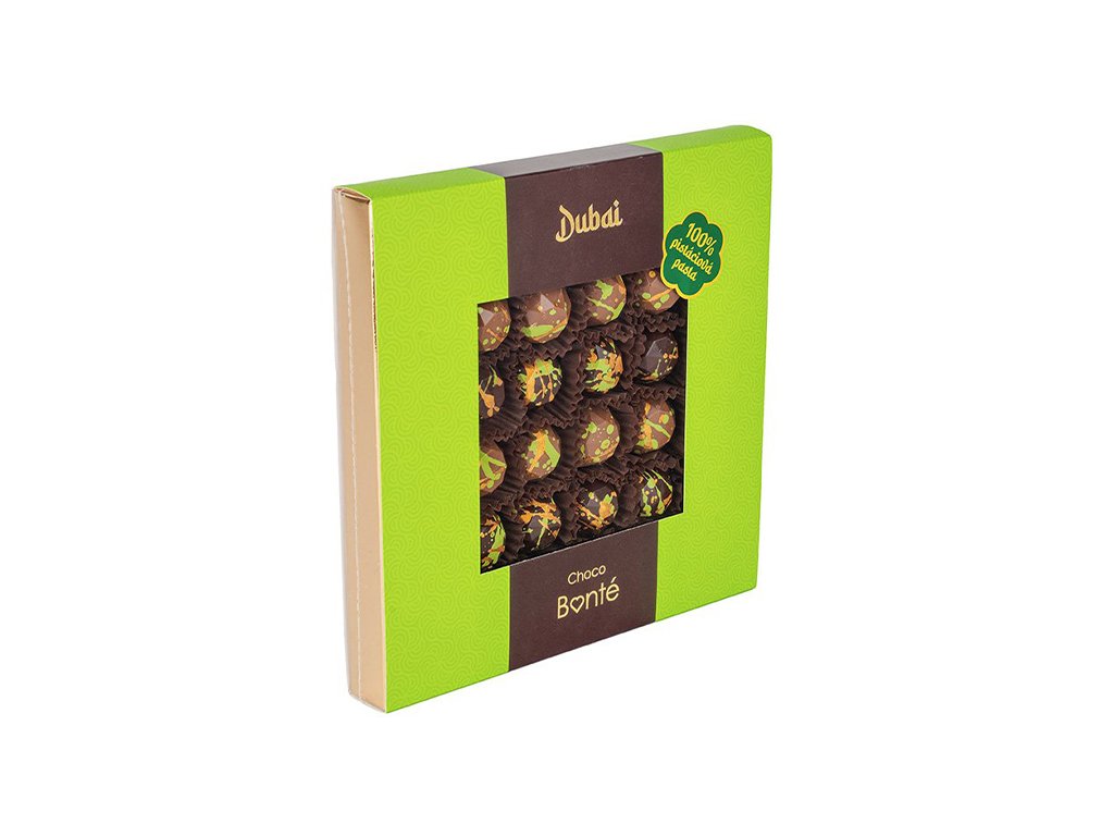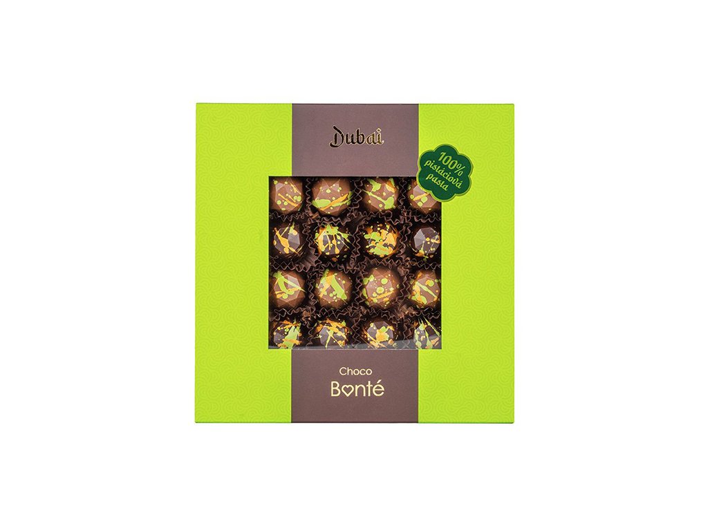 Pralinky s dubajskou náplní v kombinaci mléčné a intenzivně hořké čokolády se sametovou 100% pistáciovou pastou, tahini a neodolatelně křupavým kadayifem.
