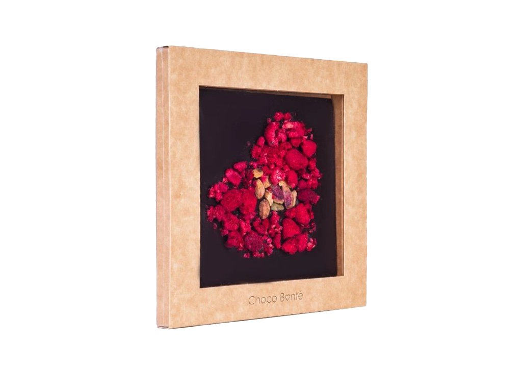 Dopřejte si výjimečný chuťový zážitek s ručně vyráběnou hořkou čokoládou ve tvaru velkého čtverce, jejíž povrch zdobí srdce vytvořené z lyofilizovaných malin a pistácií. Kvalitní hořká čokoláda s vysokým podílem kakaa se skvěle doplňuje s intenzivní ovocnou chutí sušených malin, které si zachovaly svou svěžest i barvu. Elegantní kombinace pro milovníky výrazné čokolády i romantiky. Ideální jako dárek z lásky nebo sladké potěšení jen tak pro sebe.