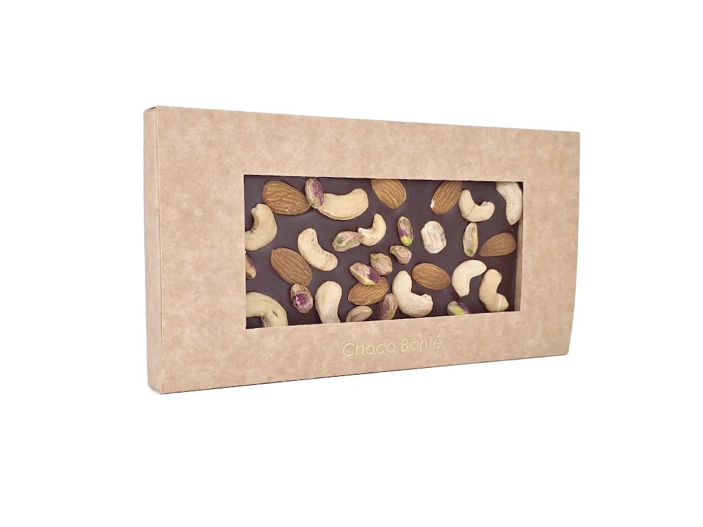 Tato hořká čokoláda s mandlemi, kešu a pistáciemi je ideální jako luxusní pamlsek pro chvíle odpočinku, originální dárek pro milovníky čokolády nebo zdravější alternativa klasického mlsání. Užijte si chuťový zážitek, který spojuje intenzitu čokolády a bohatost oříšků v každém soustu.