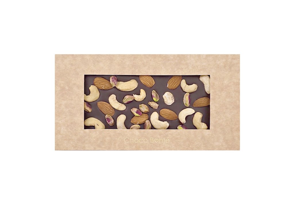 Křupavé mandle, kešu ořechy a pistácie v hořké čokoládě - harmonická souhra intenzity a jemnosti, která potěší každého milovníka poctivých chutí.