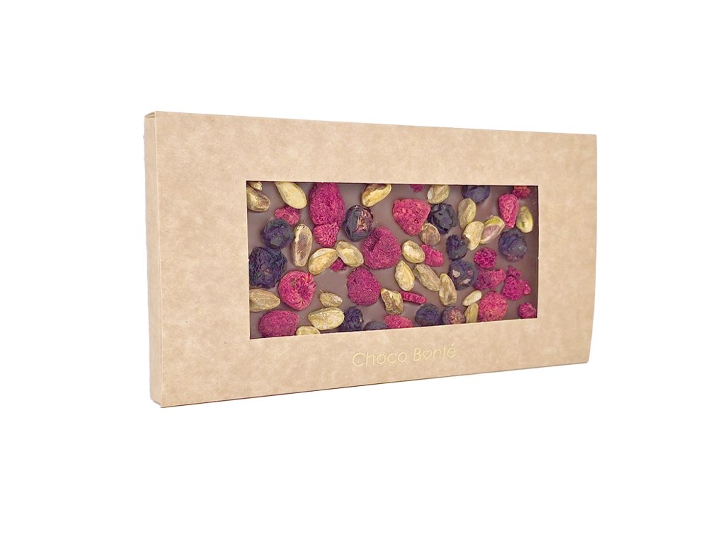 Mléčná čokoláda s borůvkami, malinami a pistáciemi