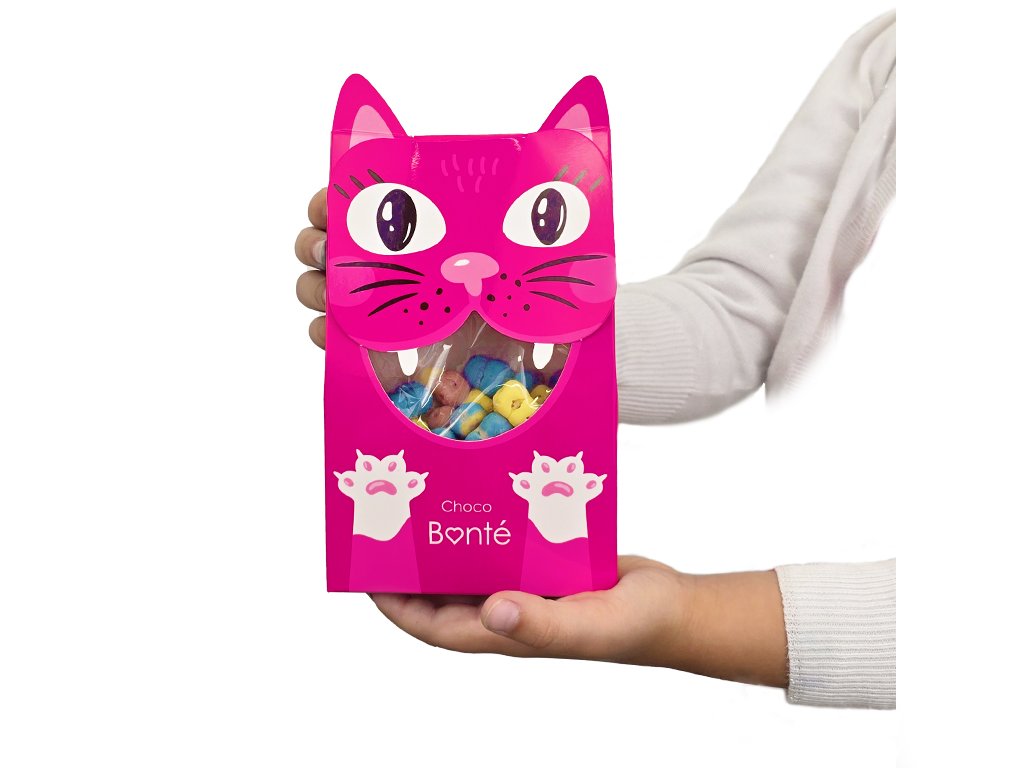 ❤ Bonboniéra Mlsná kočička (4 ks bonbonů) – designová bonboniéra s oušky a kočičí tlamičkou, uvnitř se skrývají 4 ručně vyráběné bonbony ve tvaru zvířátek z mléčné, hořké a bílé čokolády.