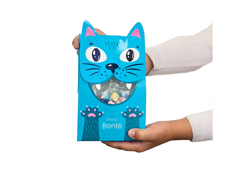 ❤ Bonboniéra Mlsný kocour (4 ks bonbonů) – designová bonboniéra s oušky a kočičí tlamičkou, uvnitř se skrývají 4 ručně vyráběné bonbony ve tvaru zvířátek z mléčné, hořké a bílé čokolády.