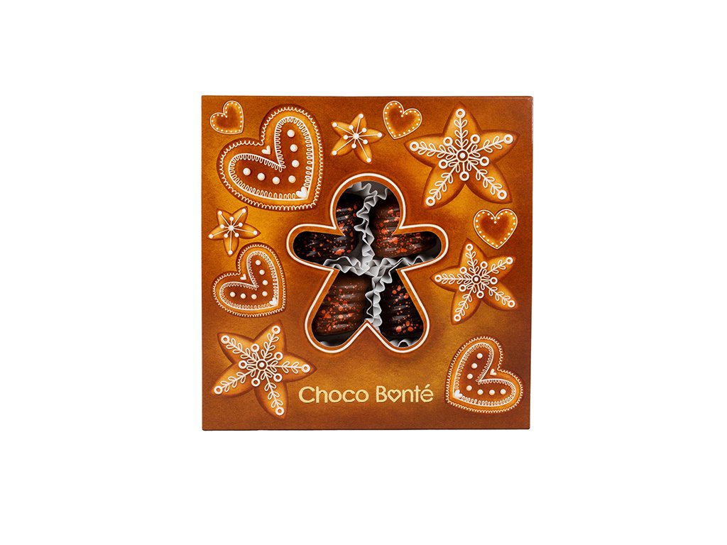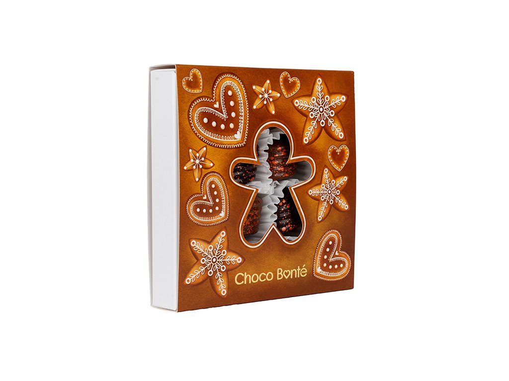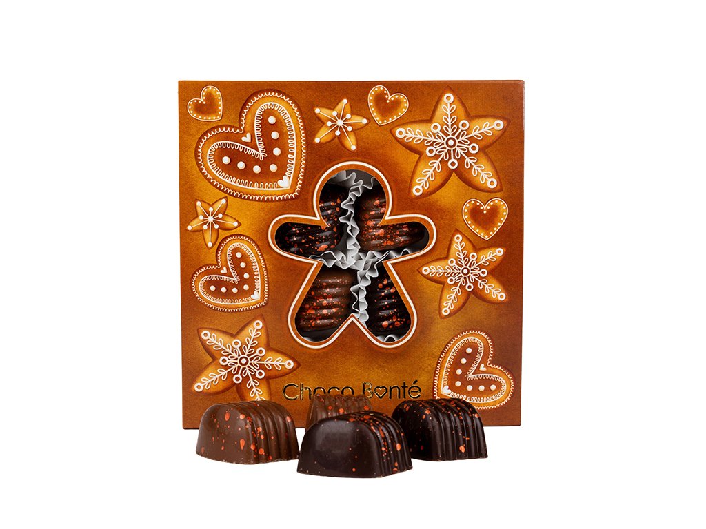Uvnitř se ukrývají čtyři ručně vyráběné pralinky z kvalitní čokolády, provoněné perníkem a zimním kořením. Každý kousek je vytvořen s péčí a radostí.