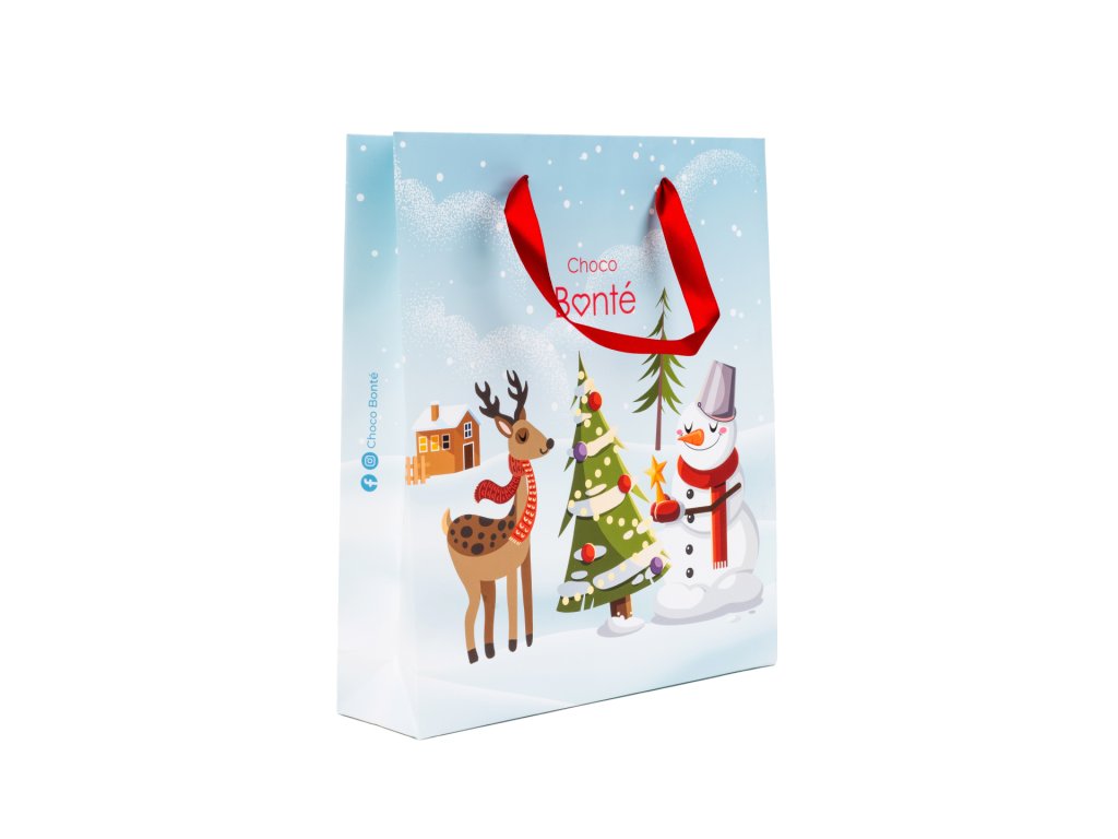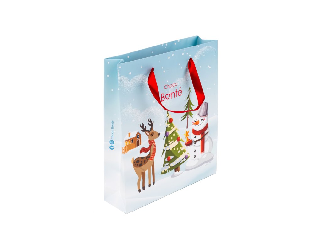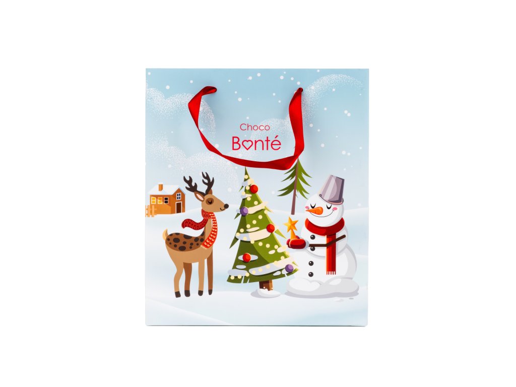 Ulehčete Ježíškovi balení sladkých dárků! 🎅 Vykouzlete úsměv na tváři nejmenších s naší střední vánoční taškou! Design se sněhuláčky a lesními zvířátky je ideální pro čokoládové produkty – bonboniéry s 8 ks pralinek, bonboniéry s 12 ks pralinek nebo bonboniéry s 16 kusy pralinek, dárkové čokolády s bonbony i klasické čokolády. Taška pojme také bylinkové čaje nebo oříšky v čokoládě.