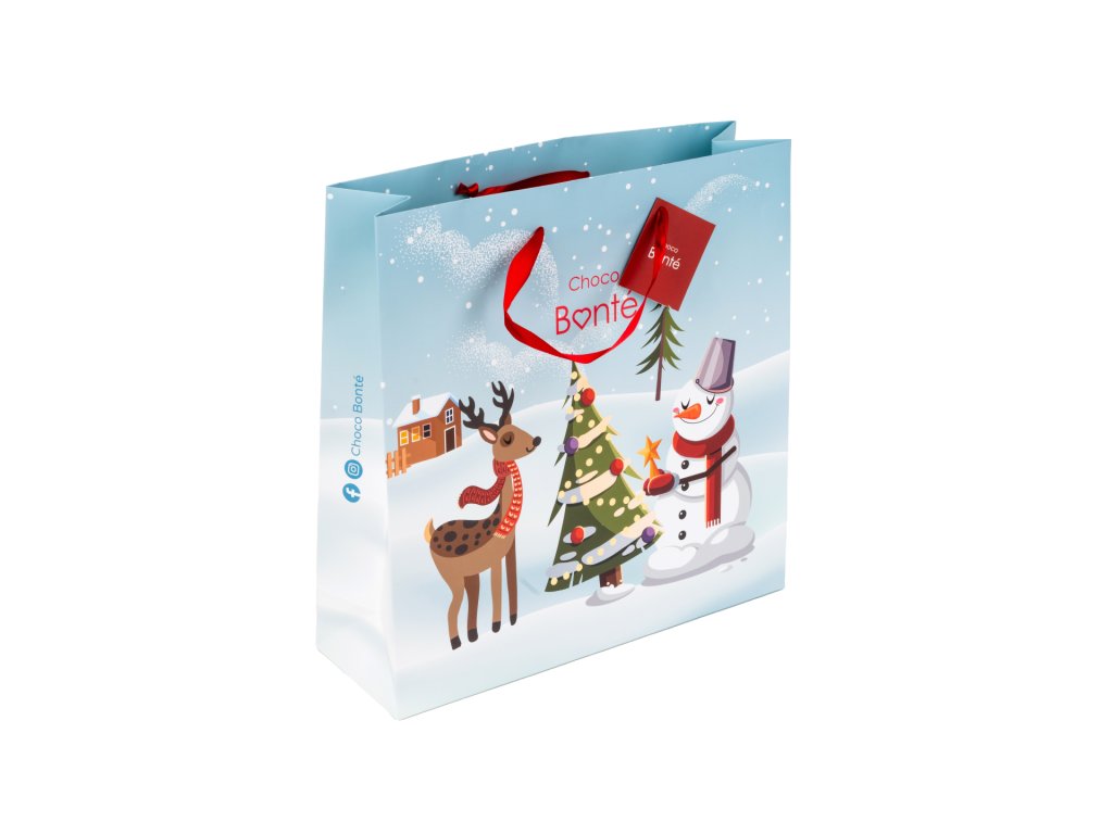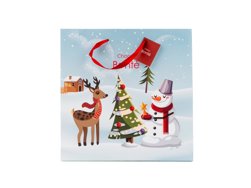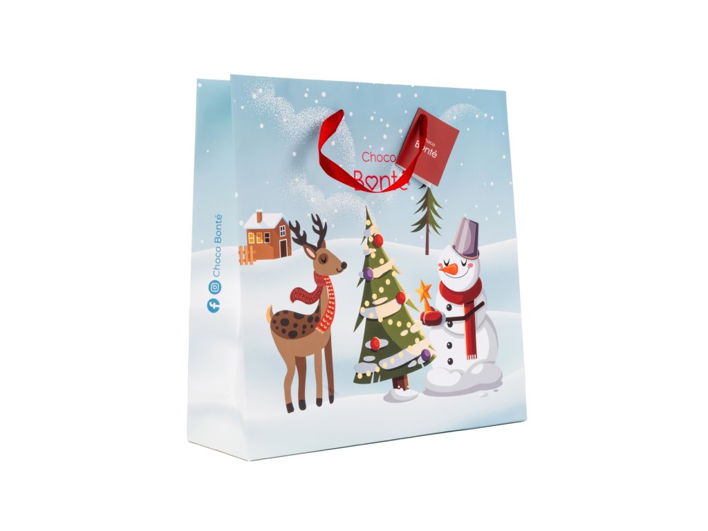 Ulehčete Ježíškovi balení sladkých dárků! 🎅 Vykouzlete úsměv na tváři nejmenších s naší velkou vánoční taškou! Design se sněhuláčky a lesními zvířátky je ideální pro balení naší největší bonboniéry s 60 pralinkami, adventních kalendářů nebo velkých čokolád. Taška pohodlně pojme také bylinkové čaje či oříšky v čokoládě.
